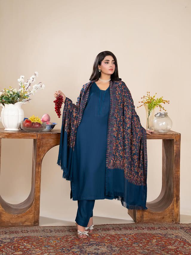 Elevate your style with this elegant deep teal dhanak three-piece suit, featuring a minimal straight-cut shirt with delicate stitching details on the neckline. Paired with matching trousers and a contrasting Dhanak embroidered shawl, adorned with intricate floral patterns in warm earthy tones, this ensemble perfectly balances simplicity with tradition.